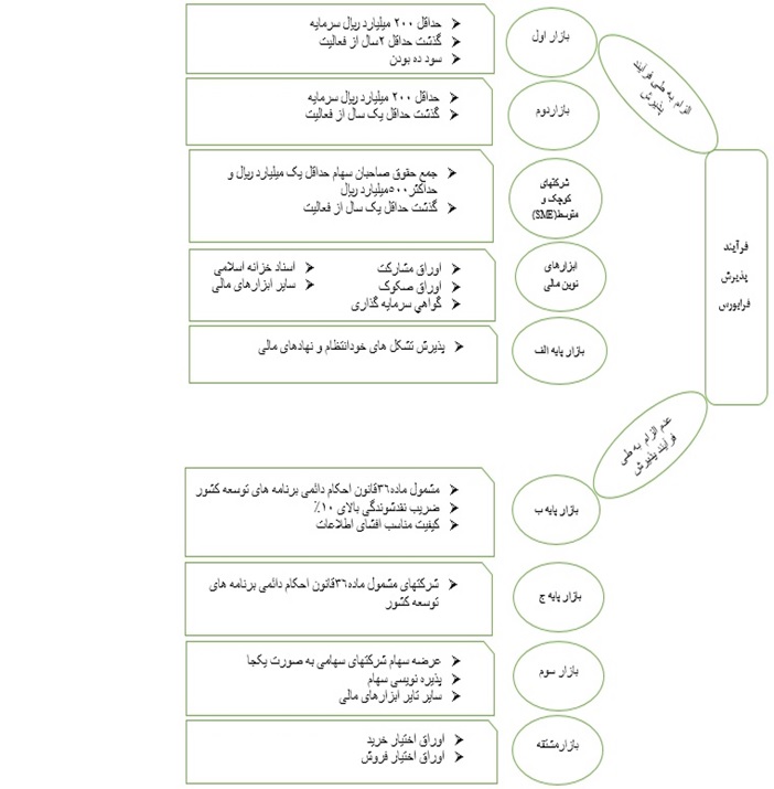ماده 99 قانون برنامه پنجم توسعه به منظور ارتقاء جایگاه بازار سرمایه در اقتصاد کشور و ساماندهی بازار متشکل اوراق بهادار بیان میدارد که کلیه شرکتها جهت معاملات اوراق بهادار باید در بازارهای بورس يا فرابورس پذیرفته شده و مورد معامله قرار گیرند. همچنین نقل و انتقال در شرکتهای سهامی عام که شرایط پذیرش در بورس یا فرابورس را ندارند نیز باید در بازار پایه فرابورس انجام شود. همچنین شرکتها میتوانند تأمین مالی مورد نیاز خود را نیز از طریق بازار سرمایه انجام دهند. معاملات اوراق بهادار ثبتشده در سازمان فقط در بورسها و بازارهای خارج از بورس دارای مجوز و با رعایت مقررات معاملاتی هر یک از آنها حسب مورد امکانپذیر بوده و معاملة اوراق بهادار مذکور بدون رعایت ترتیبات فوق فاقد اعتبار است. ثبت نزد سازمان اشخاص حقوقي كه تحت يكي از عناوين نهادهاي مالي و يا قانون توسعه ابزارها و نهادهاي مالي جديد (طبق اصل 44) تاكنون تشكيل شدهاند و نزد مرجع ثبت شركتها به ثبت رسيدهاند و نيز اشخاص حقوقي كه موضوع فعاليت اصلي آنها نهاد مالی است موظفند نهاد مالي خود را نزد سازمان بورس و اوراق بهادار به ثبت برسانند. خودداري از ثبت نهاد مالي تخلف محسوب ميشود براساس ضوابط سازمان، ثبت کليه شرکتهای سهامی عام يا شرکتهای سرمايه گذاری با سرمايه بيش از 10 ميليارد ريال نزد آن سازمان الزامی است. در اجرای مفاد قانون بازار اوراق بهادار، اوراق بهاداری که در بورس های اوراق بهادار یا بازارهای خارج از بورس معامله میشوند باید نزد سازمان به ثبت برسند. پذیرش و عرضه پذيرش در بورس به معنی تطبيق وضعيت و شرايط ناشر با شرايط مندرج در دستورالعمل پذيرش اوراق بهادار در بورس به منظور فراهم شدن امکان معامله اوراق در بورس است. براساس مقررات بازار سرمايه ، شرکتهایی که متقاضی پذيرش اوراق بهادار خود در بورس هستند ، تمام يا بخشی از وظايف خود در فرآيند پذيرش را از طريق مشاوران پذيرش که دارای مجوز از سازمان بورس و اوراق بهادار هستند ، انجام می دهند. به عبارت ديگر، مشاوران پذيرش، به عنوان رابط ميان ناشران اوراق بهادار متقاضی پذيرش و بورس ها عمل می کنند.
