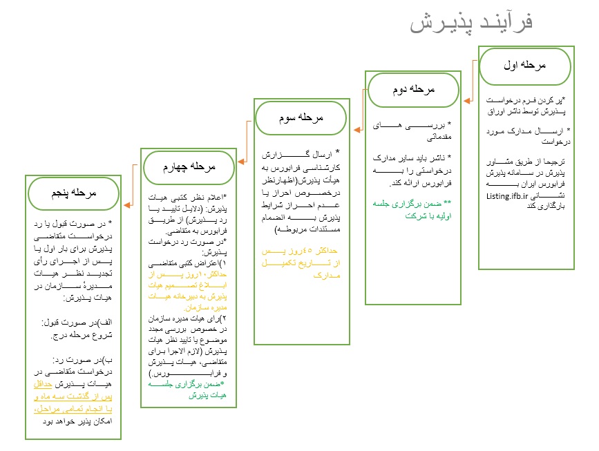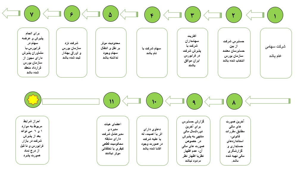 شرایط عمومی پذیرش در بورسپذيرش در بورس، صرفا در يکی از تابلوهای بازار اول يا در بازار دوم صورت می پذيرد. بورس اوراق بهادار دارای دو بازار اول و دوم میباشد که بازار اول از دو تابلوی اصلی و فرعی تشکیل شده است. متقاضی در صورت دارا بودن شرايط عمومی پذيرش سهام عادی، با توجه به شرايط خاص پذيرش سهام در هر يک از اين بازارها، بايستی تقاضای پذيرش خود در تابلو اصلی يا فرعی بازار اول يا در بازار دوم را به بورس ارائه نمايد. شرايط عمومی پذيرش در بورس ثبت نزد سازمان بورس نبود محدوديت قانونی مؤثر برای نقل و انتقال يا اعمال حق رأی توسط صاحبان سهام سهام با نام، دارای حق رأی، تمام بهای اسمی آن پرداخت شده باشد. تابعيت ايرانی شرکت. سهامی عام بودن شرکت. براساس ضوابط سازمان، ثبت تمامی شرکتهای سهامی عام يا شرکتهای سرمايه گذاری با سرمايه بيش از 10 ميليارد ريال نزد آن سازمان الزامی است. شرکتهایی که هنوز ثبت سازمان نشده اند نيز می توانند درخواست پذيرش و بررسی دهند، ولی هنگام انجام مراحل درج در فهرست نرخهای بورس، بايد ثبت سازمان صورت گرفته باشد. (نحوه ثبت نزد سازمان پيوست شماره ) چنانچه سهام بی نام باشد،مراتب در قالب سه نوبت آگهی با فاصله 5 روزه در روزنامه کثيرالانتشاری که آگهی های شرکت در آن درج می شود به اطلاع عموم می رسد. در صورتی که متقاضی پذيرش، شرکت سهامی خاص باشد، تغيير به سهامی عام قبل از درج نام شرکت در فهرست نرخهای بورس الزامی است. به عبارتی سهامی خاص بودن مانع از ارائه درخواست پذيرش نيست و می توان تغيير شخصيت شرکت را به موازات فرآيند پذيرش پيش برد.(نحوه تغيير خاص به عام پيوست شماره2) شرايط خاص پذيرش سهام عادی در تابلوهای بورس